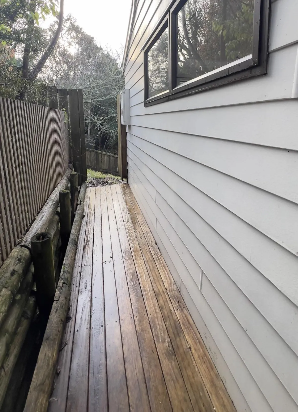 Gentle yet effective cleaning: Our low-pressure waterblasting removed years of accumulated dirt, mold, and weather staining from this deck without damaging weatherboards or delicate cladding on the building.